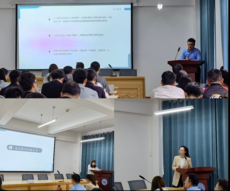 梁雅楠同学从文献阅读、课题选择、论文写作等角度进行经验分享,并介绍了自己的论文成果和主持项目;李珂同学从研究生学习生活规划和考证两方面,分享了三年研究生生活的整体规划,同时详细介绍了CFA(美国特许金融分析师)和CPA(中国注册会计师)考试的科目和备考安排,提醒同学们明确读研目标并认真规划;季鹏飞同学就实践活动和实习经历两个方面进行经验分享,分享内容包含学院组织的学术交流活动、调研实践、证券公司实习的经历等方面,让同学们对研究生生活有了深入的了解。