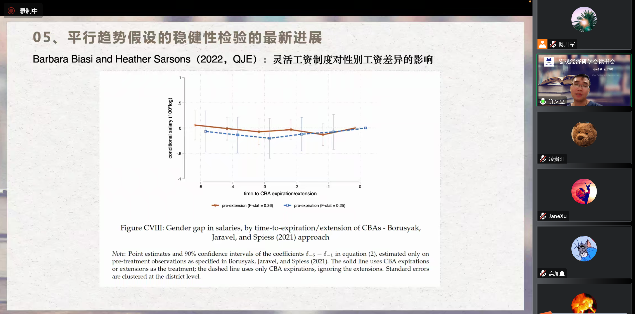 许文立博士的报告从七个方面阐述了DID实证方法的前沿进展。第一,他就DID模型的内容、原理及其本质做了简要的介绍,说明了DID的使用前提;第二,借助Goodman-Bacon的经典文献介绍了TWFE与DID的区别与联系;第三,他指出目前TWFE DID所遇到的主要问题在于权重和估计量偏误两个方面,并分别进行了分析;第四,他分享了自己采用DID及其变形展开的实证研究,说明了DID方法使用中易被忽视的环节;第五,他介绍了目前关于平行趋势假设检验的主要争论,通过引用典型文献梳理了这些争论的主要内容,并阐述了自己的观点;第六,围绕DID方法,阐述了证伪分析与事件研究方法的应用;最后,他分享了几篇DID研究方法的典型论文。