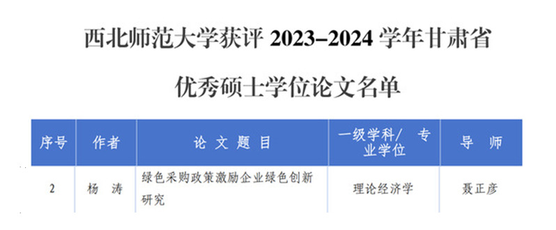 近日,甘肃省学位委员会、甘肃省教育厅公布了2023—2024学年甘肃省优秀博士硕士学位论文评选结果。西北师大共获评优秀博士、硕士学位论文20篇,其中优秀博士学位论文6篇,优秀硕士学位论文14篇。我院聂正彦教授指导杨涛同学完成的硕士学位论文《绿色采购政策激励企业绿色创新研究》荣获“甘肃省优秀硕士学位论文”。