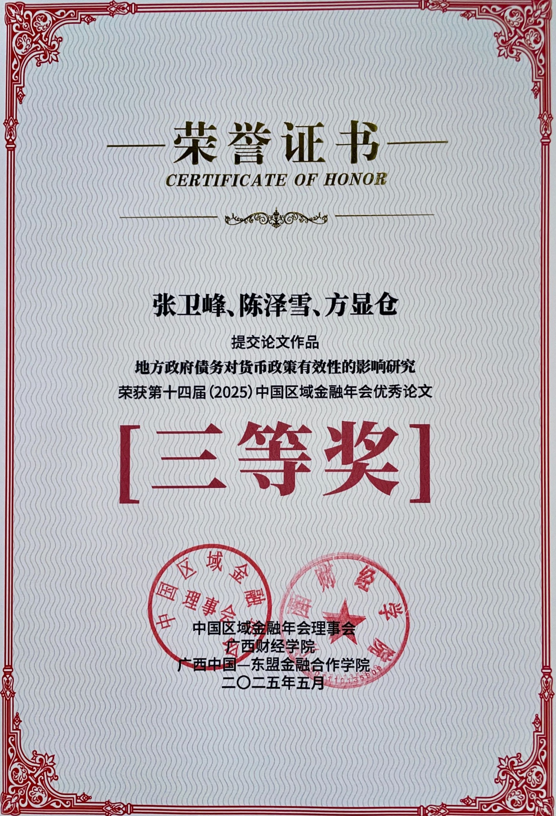 我院张卫峰副教授、陈泽雪同学的合作论文《地方政府债务对货币政策有效性的影响研究》入选年会,并受邀在“金融市场稳定与金融高质量发展”分论坛汇报交流。该论文最终荣获优秀论文三等奖。