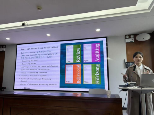 培训会上,童诗恩老师从权威经济学外文学术资源介绍、EBSCO数据库使用技巧、EBSCO移动端应用、技术支持等方面展开培训,现场演示了如何利用AI工具快速分析文献要点、梳理研究脉络,案例与行业前沿动态追踪等内容,让在场师生直观感受到AI为传统文献调研方式带来的革新。